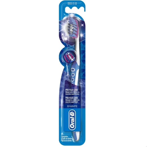 مسواک اورال بی سری Pro-Flex مدل 3D White Luxe با برس نرم دارای الیاف Power Tip جهت دسترسی بیشتر به نقاط دور از دسترس دهان می باشد و یک ویژگی منحصر به فرد را نیز داراست که با کم رنگ شدن الیاف نشانگر آبی می توان زمان تعویض مسواک را تشخیص داد. همچنین این محصول دارای الیاف متقاطع با زاویه 15 درجه (CrissCross) می باشد که به سطوح بین دندانها بهتر نفوذ کرده و در مقایسه با مسواکهای معمولی مقدار بیشتری پلاک را از بین دندانها برمیدارد.